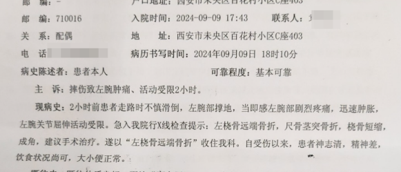 案例二:2024年9月9日,客户梁先生的母亲走路时不慎滑倒,左腕部撑地,就医后以“左桡骨远端骨折”住院治疗,产生医疗费用17181.46元,其中社保报销9073.51元,结束治疗后,梁先生在2024年9月28日向我司报案并提供了相应的索赔资料。我司在扣除社保报销和自费部分后,当天支付赔款5780.8元。